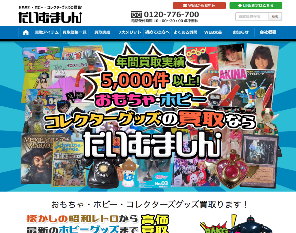 フィギュア、ラジコン、ミニカー、プラモデル、鉄道模型、ドール、超合金、レゴ、アメトイ、ゲーム、ベアブリック、DVDブルーレイ、レトロ玩具、オーディオ機器などに特化しています。